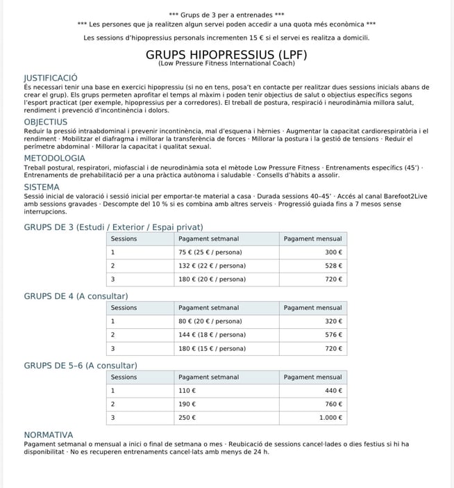 GRUPOS DE 3 A 6: Para iniciar grupos de 3 a 6 personas a estos precios tan económicos deben primero tener todas las personas del mismo una base del ejercicio hipopresivo habiendo estado ya 3 meses en grupos de 3 (anteriormente descrito) o haber cursado un mínimo de clases personales conmigo previamente.
