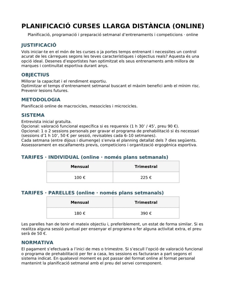 Si necesitas un trato más personalizado, una especificidad continuada en tu vida deportiva o simplemente aprender y educar a tu cuerpo, no lo dudes: Tienes a tu disposición este novedoso servicio online o envivo para el runner.